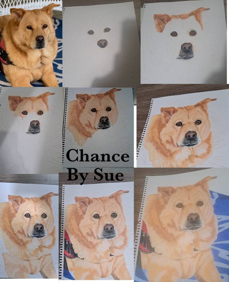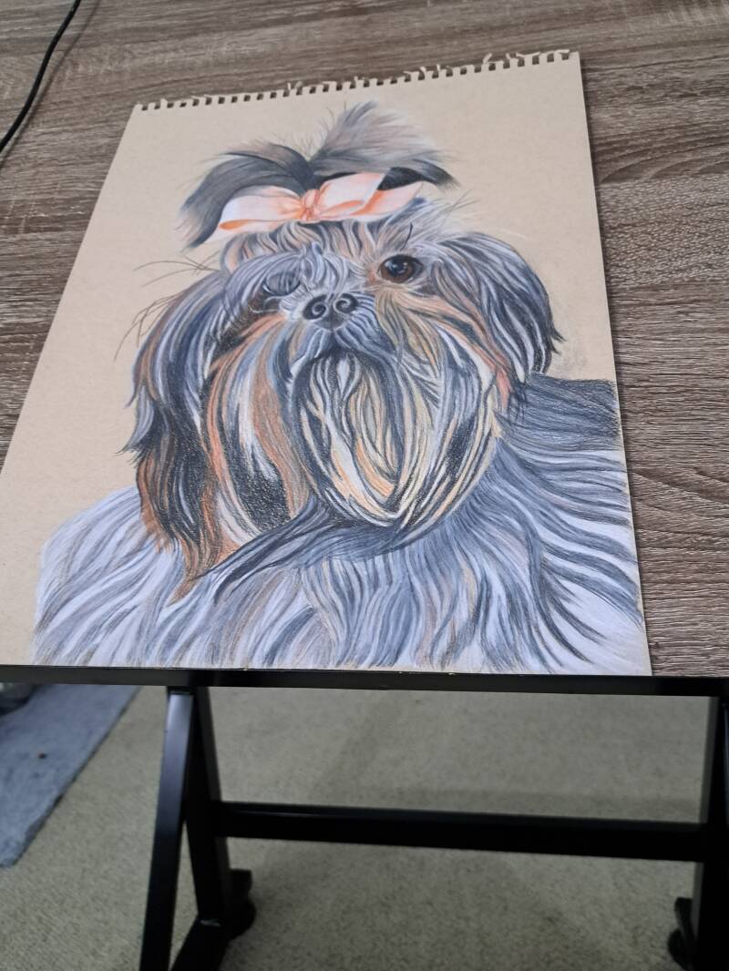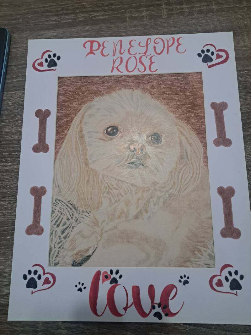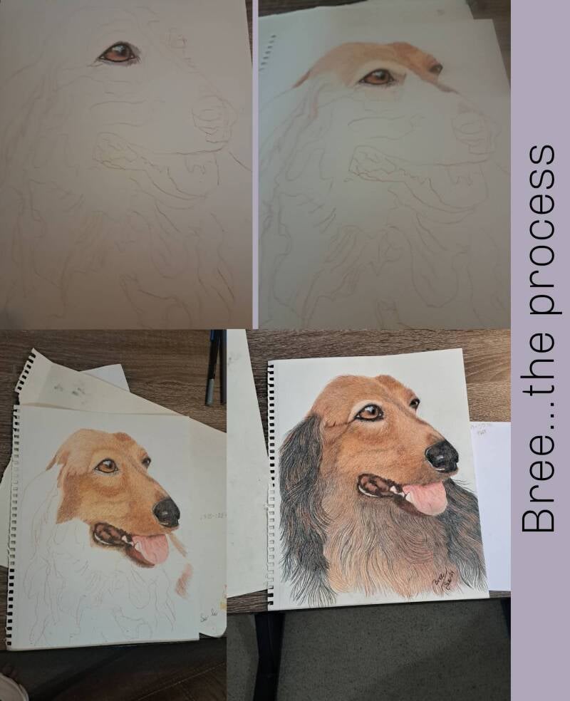 Let me introduce you to Joey, Juno,Gracie, Jett and Lucy. This is color pencil on wood. This took me 128 hours to do. The owner I'd very happy.